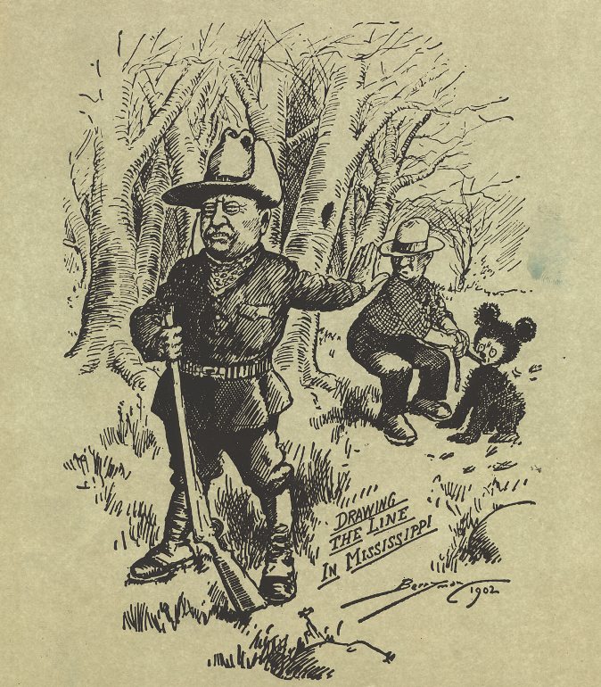 In 1902 Teddy Roosevelt hunted bear near Smedes, Mississippi. He didn’t get a bear, as he had hoped. Trip guides tracked a bear with dogs, clubbed it, and tied it up. The bear was offered to TR to shoot.