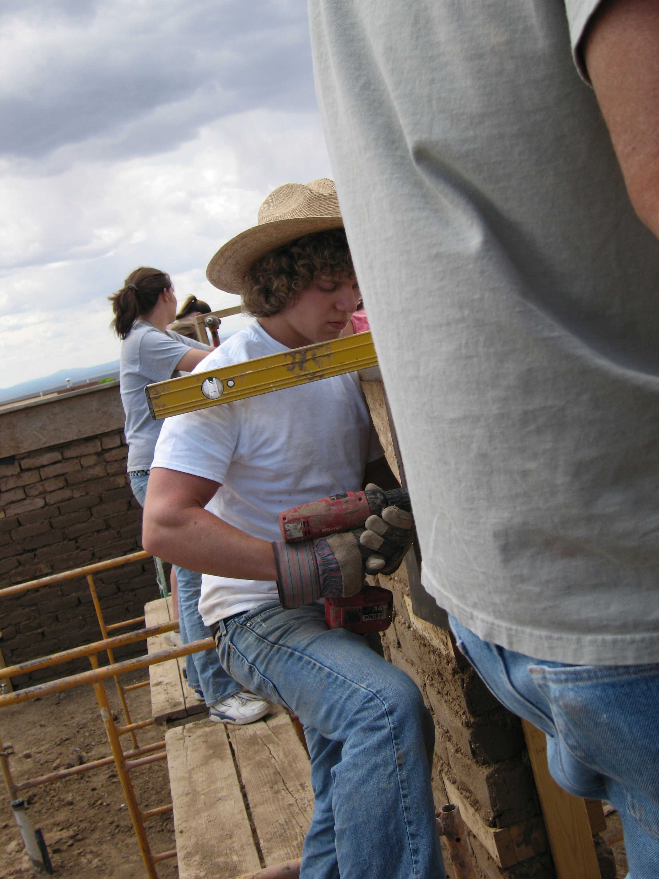 Photo taken 12 hours ago, on July 5, 2007, of student James Darrell applying lessons in building with adobe, in an adobe house under construction in Taos, New Mexico. Photo taken while photographer was balanced precariously atop a ladder and holding concrete forms. Copyright 2007, Ed Darrell