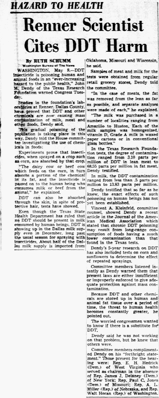 The Dallas Public Library makes available much of the news from the Dallas Morning News of the last century. On my way to find something else, I plugged in “DDT” as a search term. Among other articles that popped up was a May 9, 1951 story of Texas scientists warning a Congressional committee of the harms of DDT.