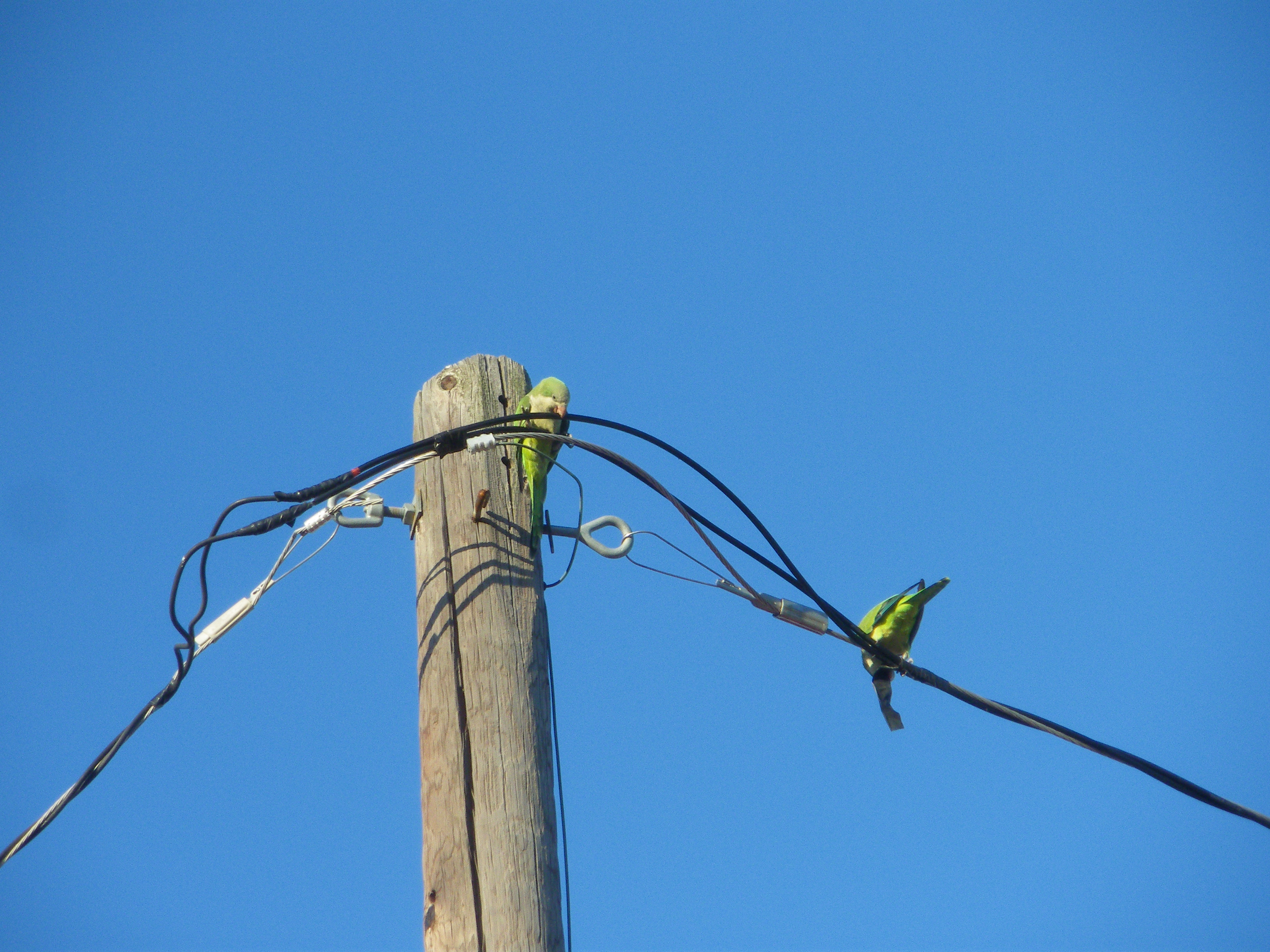 Monk parakeets are invasive in Texas — it is thought the wild flocks developed from a few dozen escapees in the past three decades. They favor nesting on tall electrical poles — the stadium lights of the high school and college football stadia host a lot, as do electrical transmission lines. At Verizon Wireless we had at least one occasion when one of our cell tower climbers was attacked by one of the birds, apparently a mother just after the chicks had hatched. Cell towers provide excellent habitat for the birds.