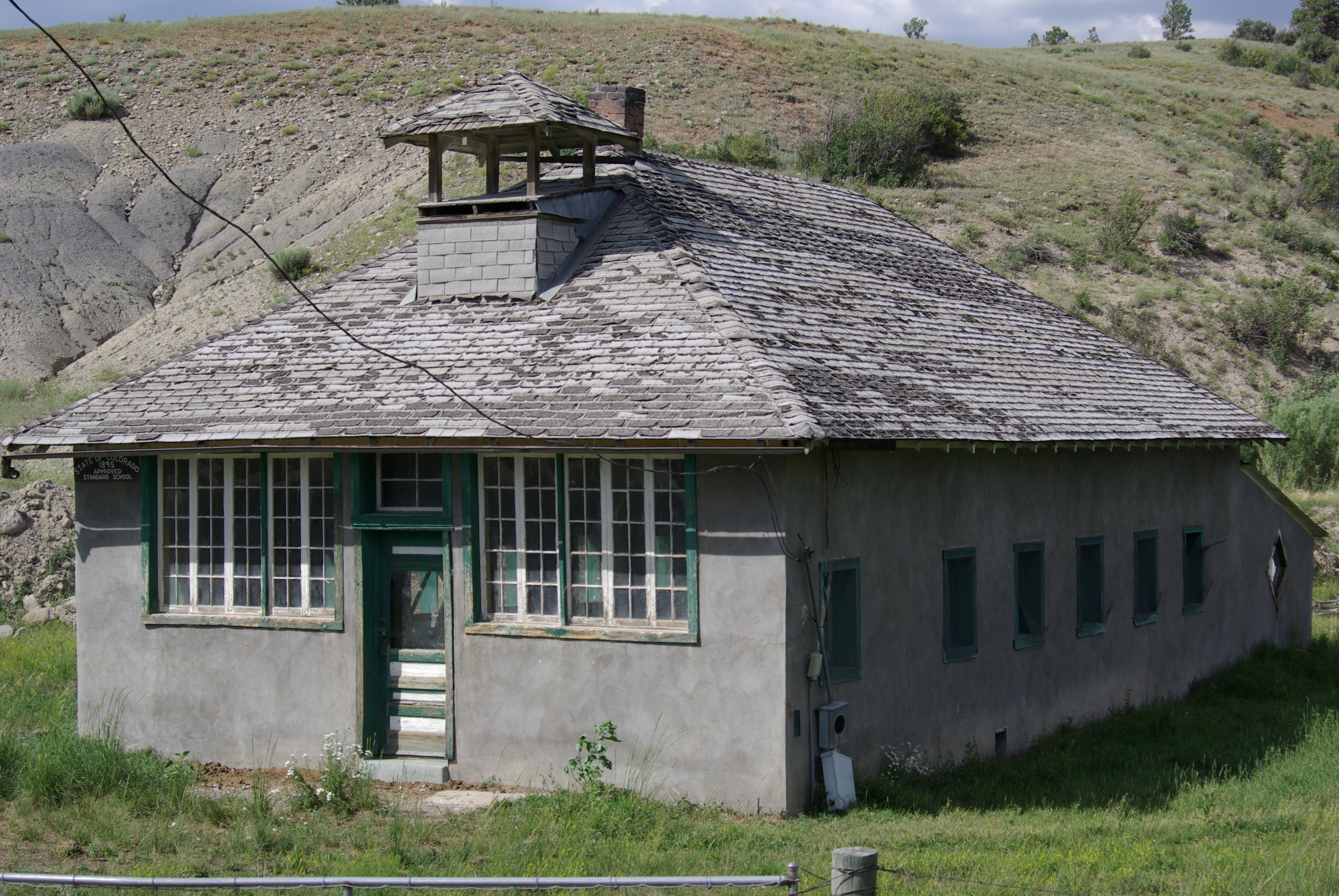 East of Durango, along U.S. Highway 160 84, a school building with a sign suggesting it was built in 1895. The map said it was Chromo, Colorado. Photos by Ed Darrell; use with attribution is encouraged.