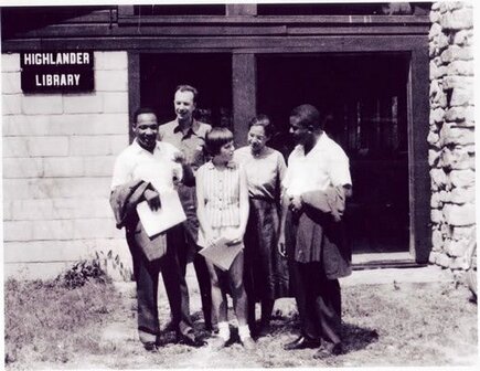 Except, it was 1957. The farm is the Highlander School. The five people in the photo include folksinger Pete Seeger, and Rosa Parks, and the Rev. Dr. Martin Luther King, Jr.