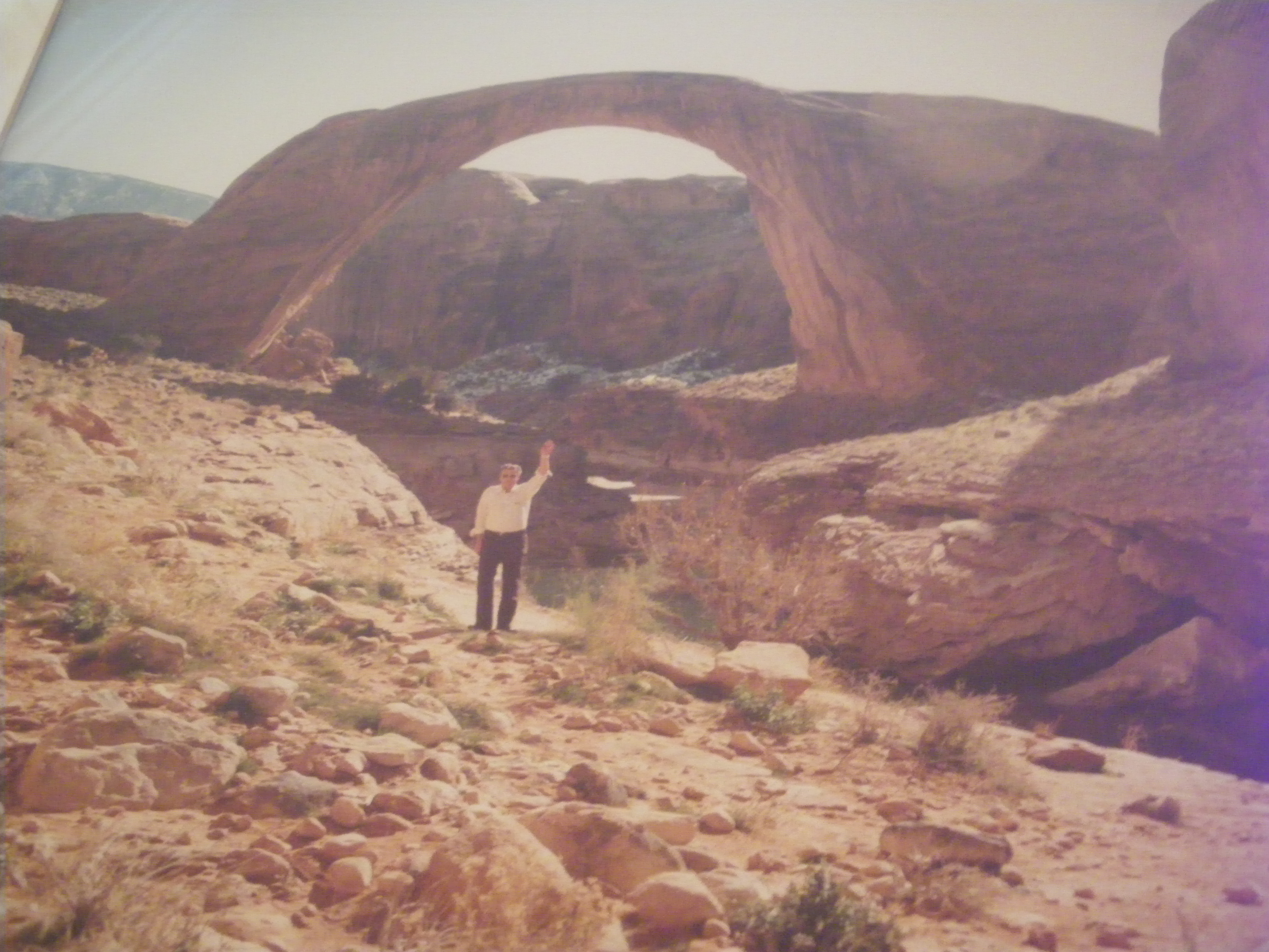Well, the Park Service and FAA were outraged to hear of the event. They subpoenaed the film footage, and blew up every frame to see if they could get the tail number on the airplane. To be honest, I don’t know how that turned out. I do know that on my wall I have a large photograph of my late brother, two by two-and-a-half feet, waving to the cameraman, with Rainbow Bridge in the background. That frame didn’t have any useful information, and the law gave him the photo.