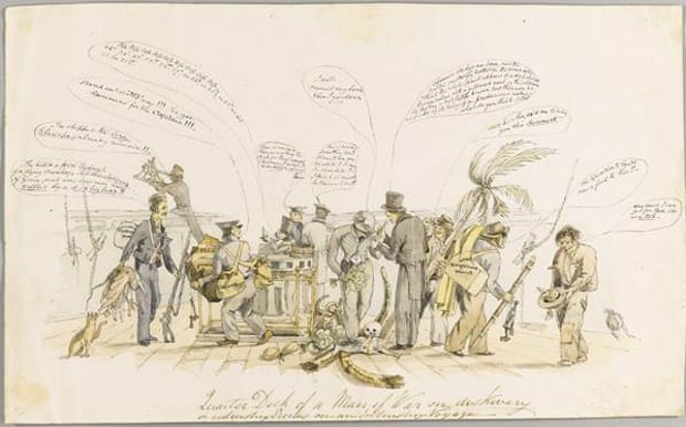The watercolour, painted while the Beagle was anchored off the Patagonian coast in 1832, around September 24, shows fossils and botanical specimens being hauled aboard for examination by Darwin, who commands the centre of the painting in top hat and tails. The event followed Darwin’s trip ashore at Bahia Blanca, Brazil. Painting is by by Augustus Earle, who was hired as shipboard artist by Capt. FitzRoy in October 1831, but had to quit the ship soon after this painting, due to ill health. From The Guardian.