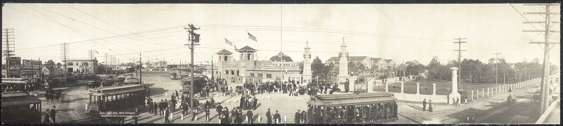 From the astonishingly vast vaults of the Library of Congress, a panoramic photograph of the main entrance of the Texas State Fair, in 1908. This is almost certainly Dallas, and this is probably the same entrance where today the short-rail mass transit trains pass by — a century later, and Dallas has once again got mass transit.